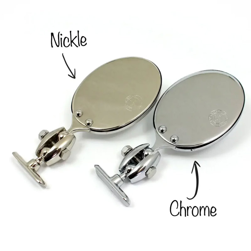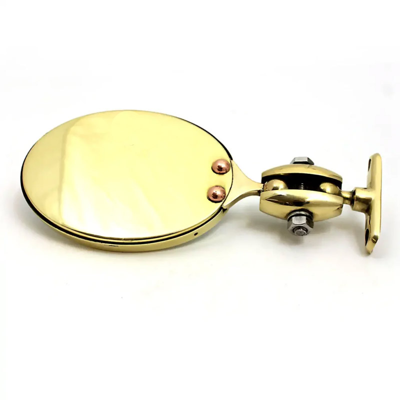 A vintage oval mirror, particularly suitable for vehicles of the 1930s and 1940s. Equivalent to the Desmo 263 model. The back of the mirror casing is embossed ‘Toby Mitchell – Toby – London NW1’, the mark Vintage Supplies has applied to its authentic reproductions of selected early pattern lamps and mirrors for over 30 years, continuing the manufacture and development of John Mitchell high quality ‘Toby’ branded product range. Available in polished brass, nickel-plated or chrome-plated.